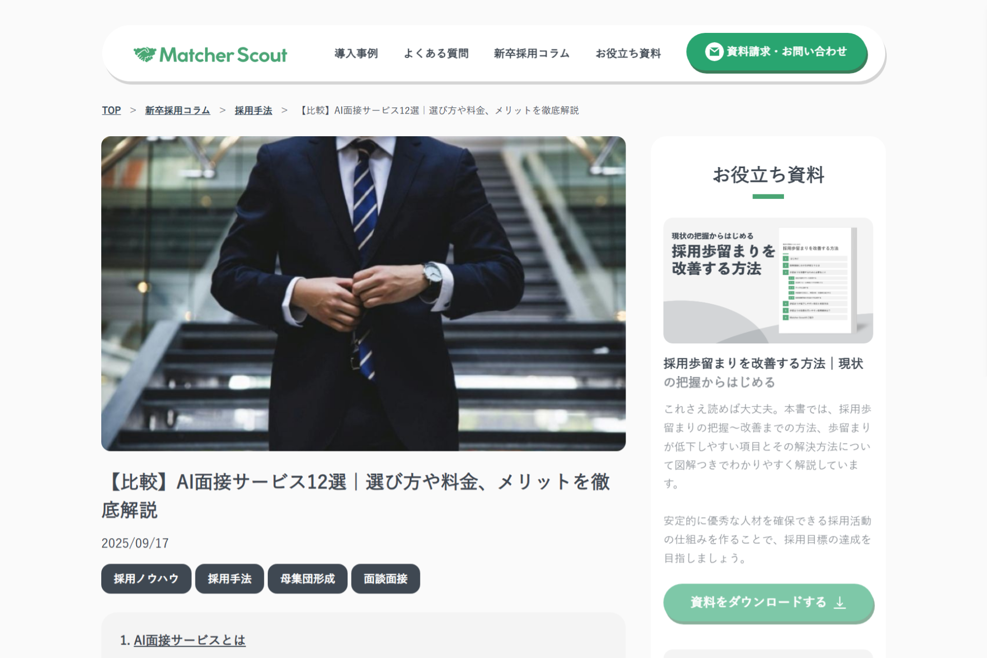 メディア運用事業などを行うMatcher株式会社が運営する、運用代行型の新卒採用ダイレクトリクルーティングサービス「Matcher Scout」で、DuDo AI面接を紹介していただきました。